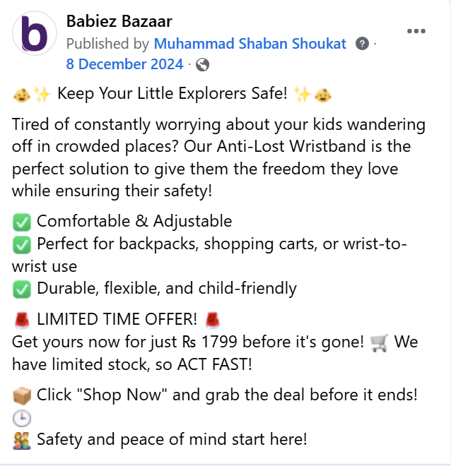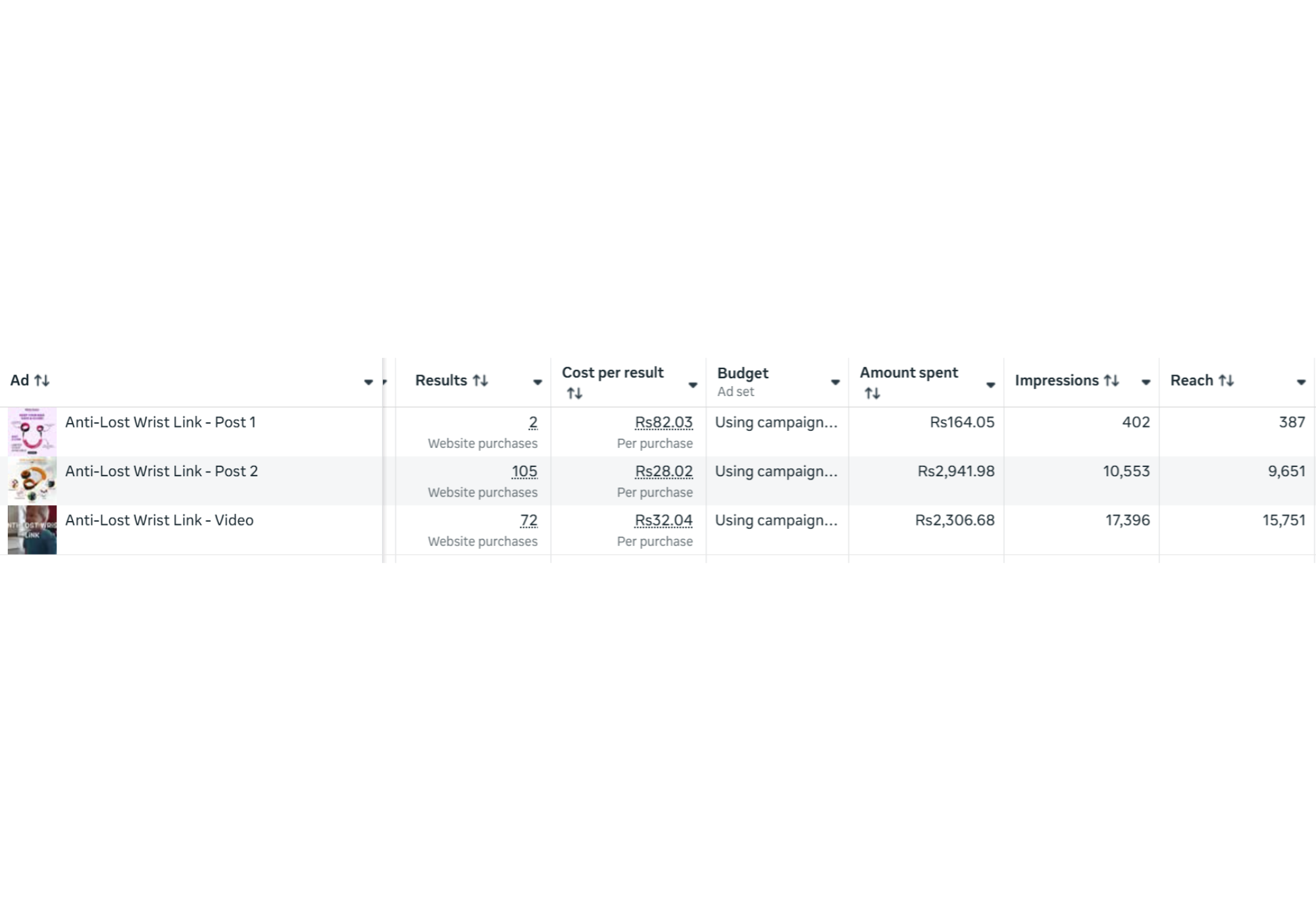Ran a high-performing conversion-focused Facebook Ads campaign for the Anti-Lost Wrist Link product, optimized directly for website purchases. Using a mix of image and video creatives, the campaign delivered strong sales volume at exceptionally low costs per acquisition, proving effective targeting, compelling creatives, and efficient budget allocation.
